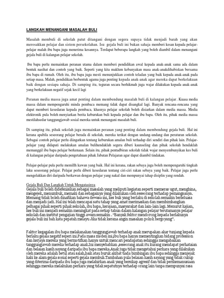 Punca dan cara mengatasi gejala buli dalam kalangan pelajar sekolah. Perkara ini disebabkan oleh mereka yang baru dikenalinya melalui laman sosial. Dengan itu saya membuat keputusan memaparkan apakah makna disebalik kuputusan diperolehi anda.